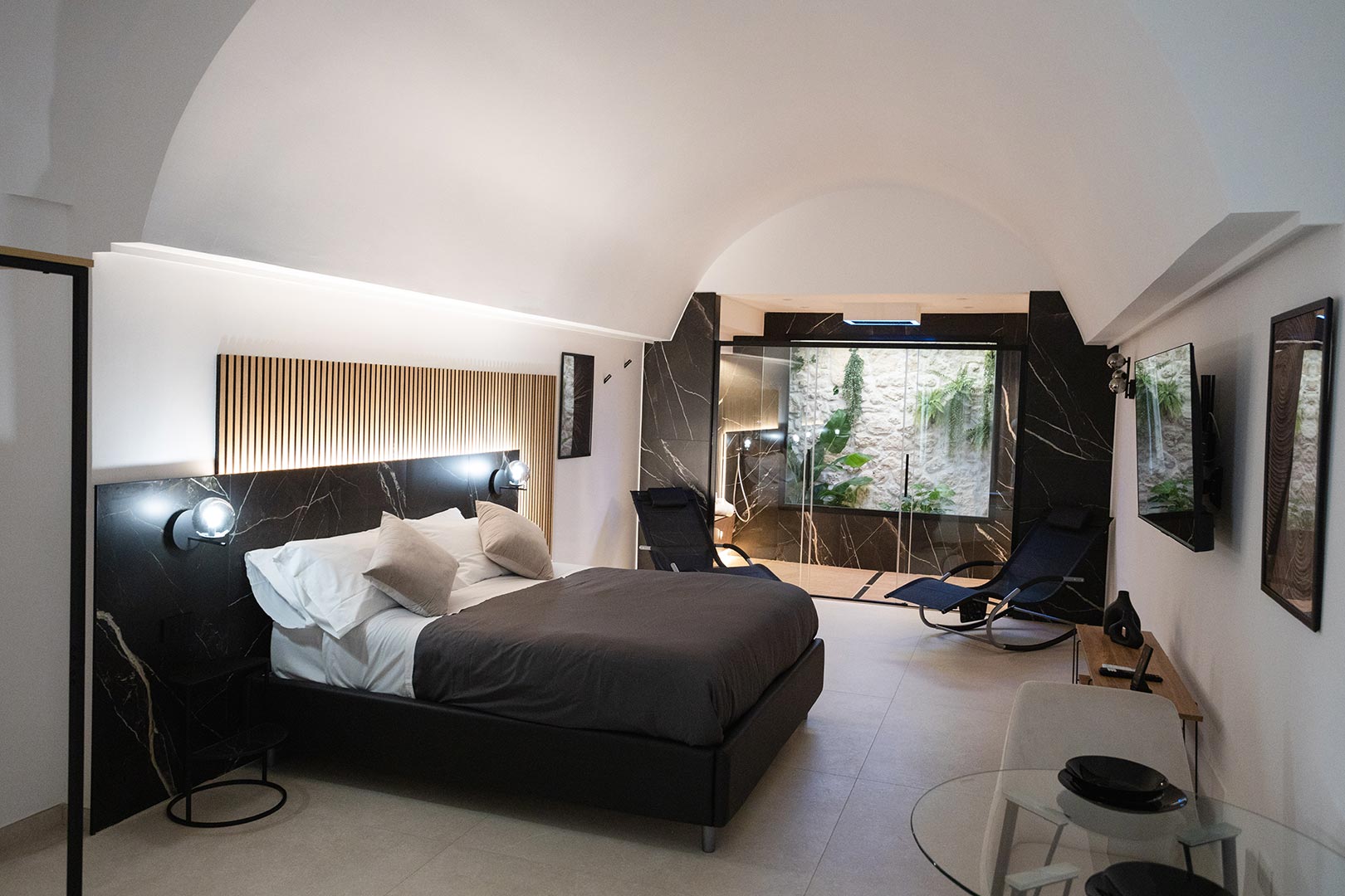 Questa raffinata camera doppia è un’oasi di eleganza e comfort, ideale per un soggiorno all’insegna del relax. La doccia emozionale multifunzione, dotata di cromoterapia e sedute per massaggi cervicali, lombari e plantari, è un vero e proprio angolo di benessere. La sua ampiezza, insieme alla vetrata che si affaccia su un lussureggiante effetto giungla con piante tropicali, trasforma ogni momento in un’esperienza sensoriale unica e avvolgente, dove natura e comfort si fondono in perfetta armonia.
